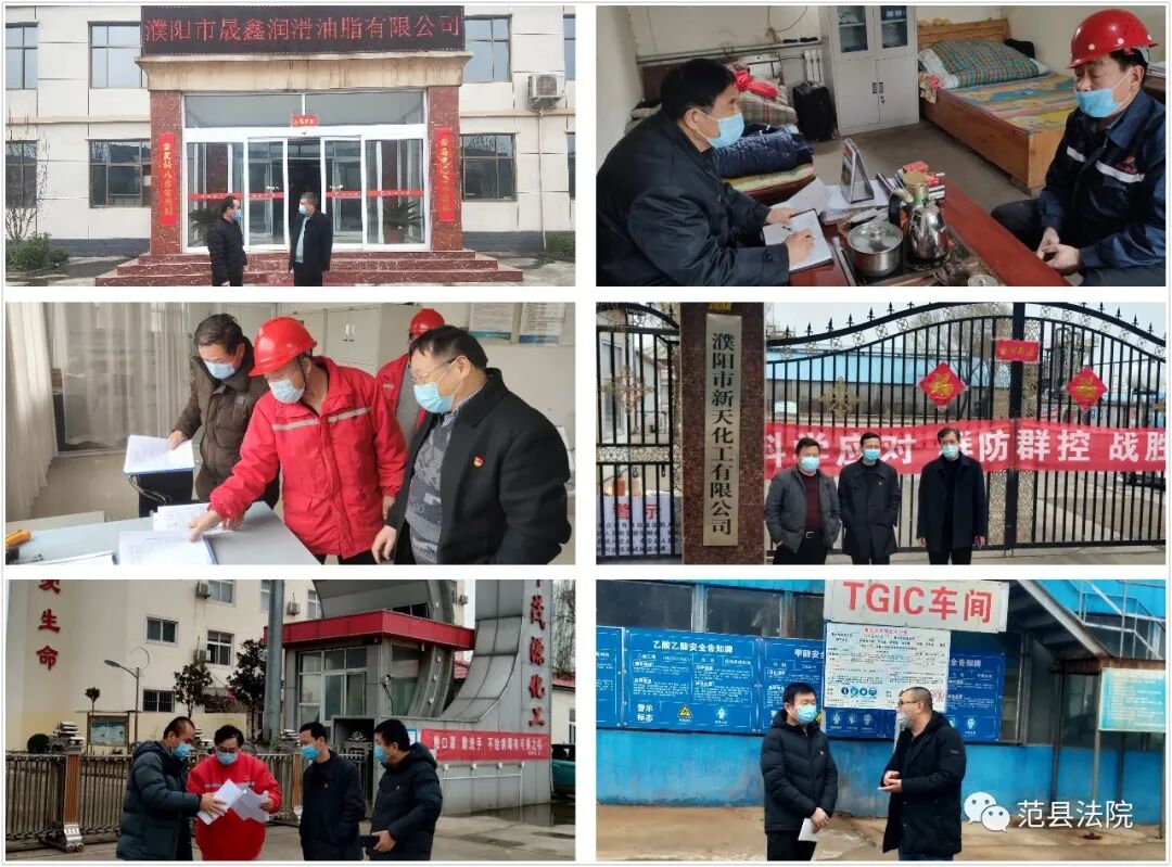 2月28日,范县法院党组书记、院长高贯玺和其他院领导走访调研了濮阳市中博石油化工有限公司、濮阳市宏大圣导新材料有限公司、濮阳市茂源化工实业有限公司、濮阳市新天化工有限公司等7家企业,指导企业做好复工复产的相关疫情防控措施,并将复工企业涉及的劳动用工、交易合同履行、经营刑事风险防范等典型法律问题进行提示告知,为企业复工复产提供有力的法律支撑,护航企业正常生产经营。