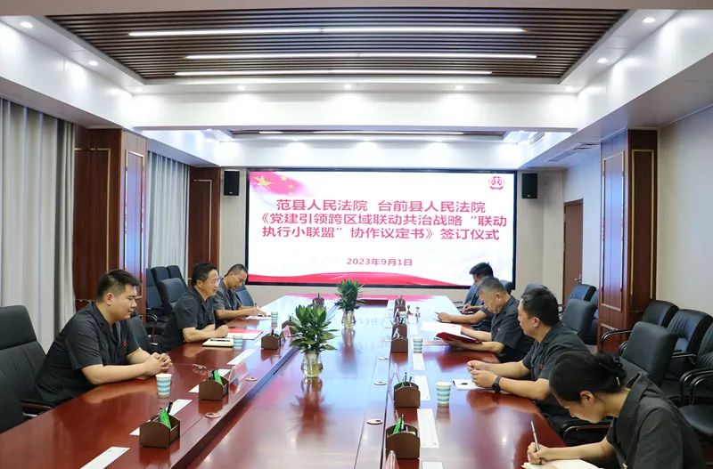 为深入贯彻全国法院“一盘棋”思想,进一步推进切实解决“执行难”,破解异地执行“开展难、寻人难、拘留难”问题。9月1日下午,范县法院与台前法院举行党建引领跨区域联动共治战略“联动执行小联盟”协作议定书签订仪式。双方签订《联动执行协作议定书》,召开执行联动联席座谈会,架起两地法院执行协作桥梁。台前法院党组成员、副院长刘传广,范县法院党组成员、副院长史庆彬以及两法院政治部、机关党委、执行局的有关同志参加座谈。