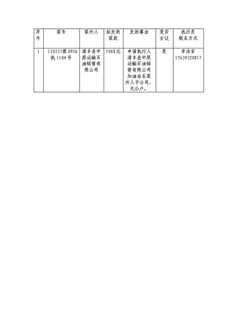 濮阳市范县人民法院向案外人发放 执行案款公示