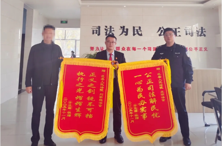 “感谢您,法官!多亏了您的耐心调解,不仅我的钱有了着落,更重要的是,我们的友谊又回来了!”11月12日,申请执行人苏某特意定制了两面锦旗,专程送到范县法院,表达感激之情。