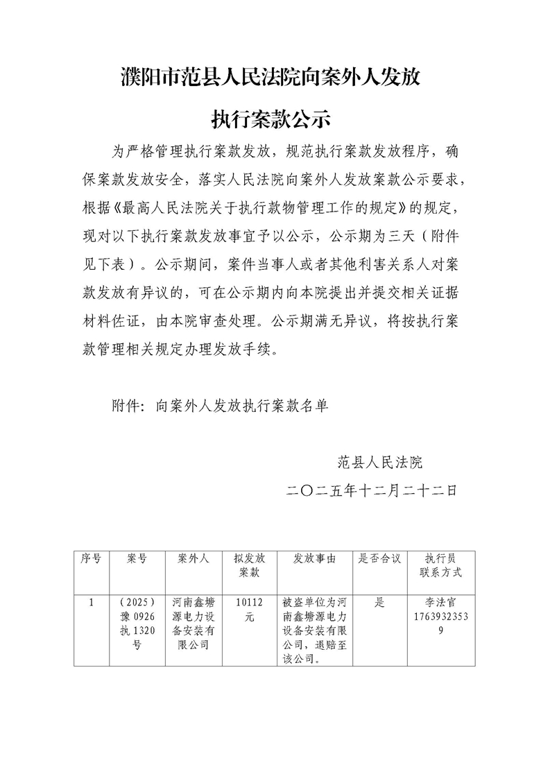 濮阳市范县人民法院向案外人发放执行案款公示