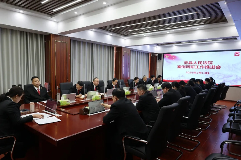 为深入贯彻落实上级关于抓实法院文化建设部署安排,2月13日,范县人民法院召开2026年案例调研工作推进会。党组书记、院长董会平主持会议并讲话,党组副书记刘志平,党组成员、副院长吴春奎,党组成员、政治部主任董睿,党组成员、副院长李宏勇,专职审委会委员李艳、许书玮,各业务部门负责人、全体审委会委员参加会议。