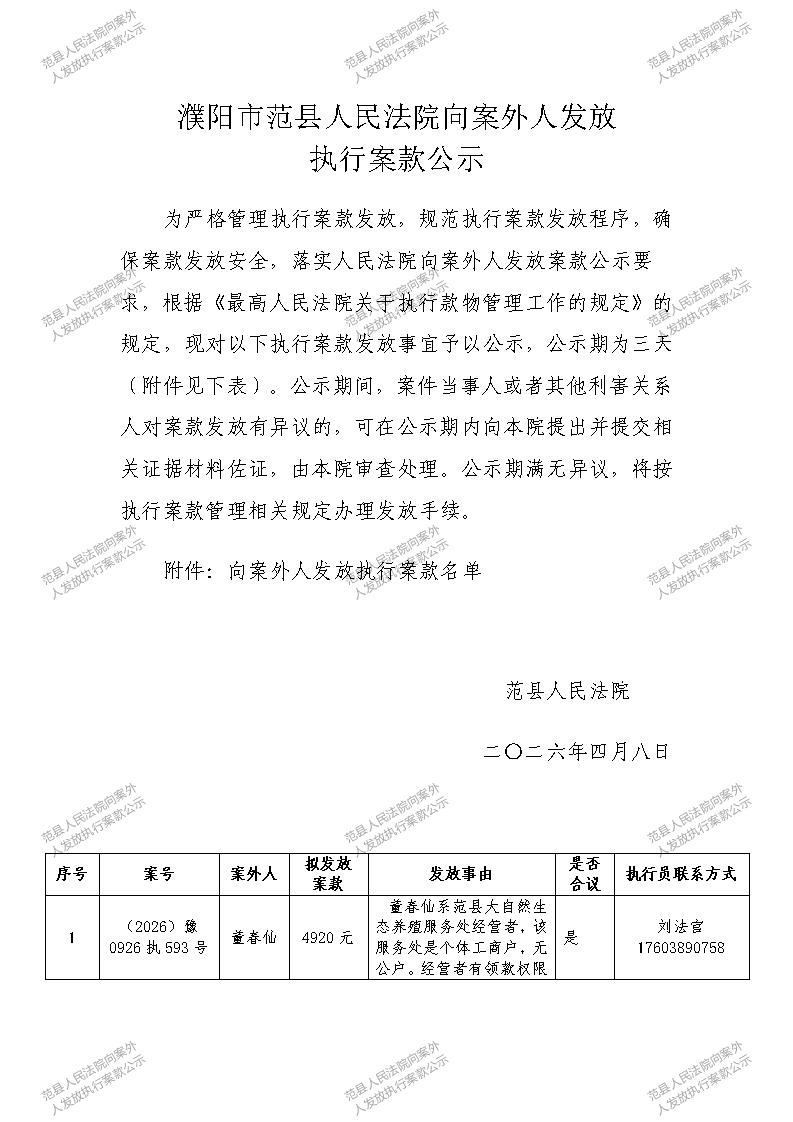 濮阳市范县人民法院向案外人发放 执行案款公示(202610)